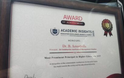 Academic Insights Education and Excellence Awards & Summit – 2025 Dr. B. Azmathulla, Principal, Sri Siddhartha Institute of Management Studies, Tumkur, was honored with the “Award of Achievement for the Most Prominent Principal in Higher Education – 2025.” The recognition was conferred at the Academic Insights Education and Excellence Awards & Summit. The award acknowledges […]