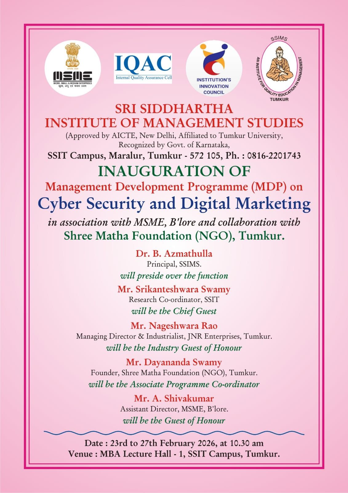 Inauguration of MDP on “cyber security and Digital marketing” in association with MSME,B’lore and shree Matha Foundation(NGO), Tumkur.