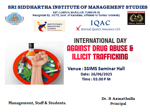 SSIMS to celebrate the International Day Against Drug Abuse and Illicit Trafficking on 26/06/2025 at MBA Seminar Hall, SSIMS, Tumkur