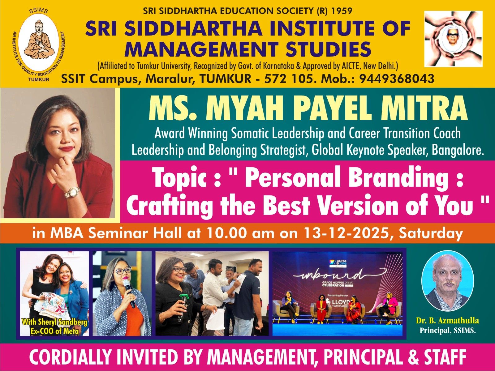SSIMS organised by One Day webinar on 13/12/2025 @ 10.00 AM venue : MBA Seminar Hall, Resource Person : Ms. Myah Payel Mitra Award wining Somatic Leadership & career Transition Coach Leadership & Belonging Strategist Global Key Note Speaker, Bangalore. Topic: “Personal Branding Crafting the Best version of You” https://www.facebook.com/share/v/1AJBthZC7y/ Facebook Live program link […]