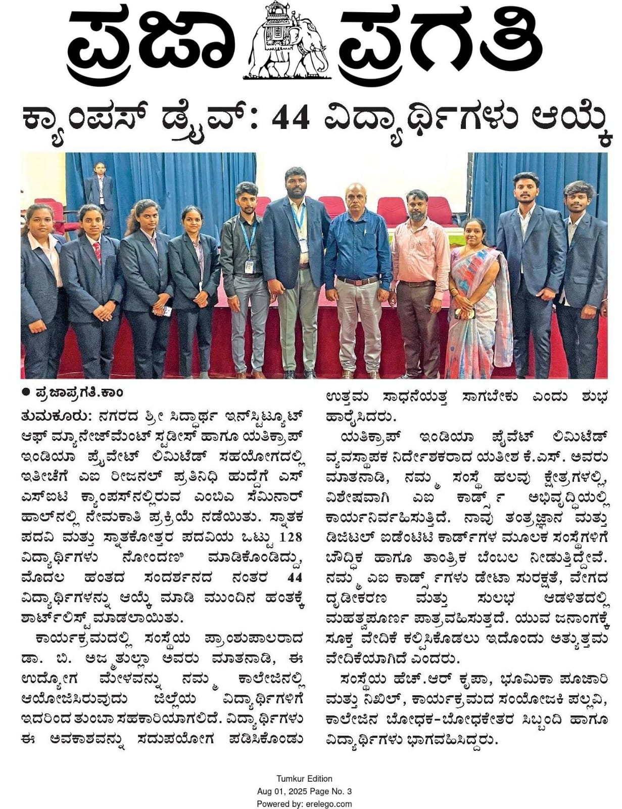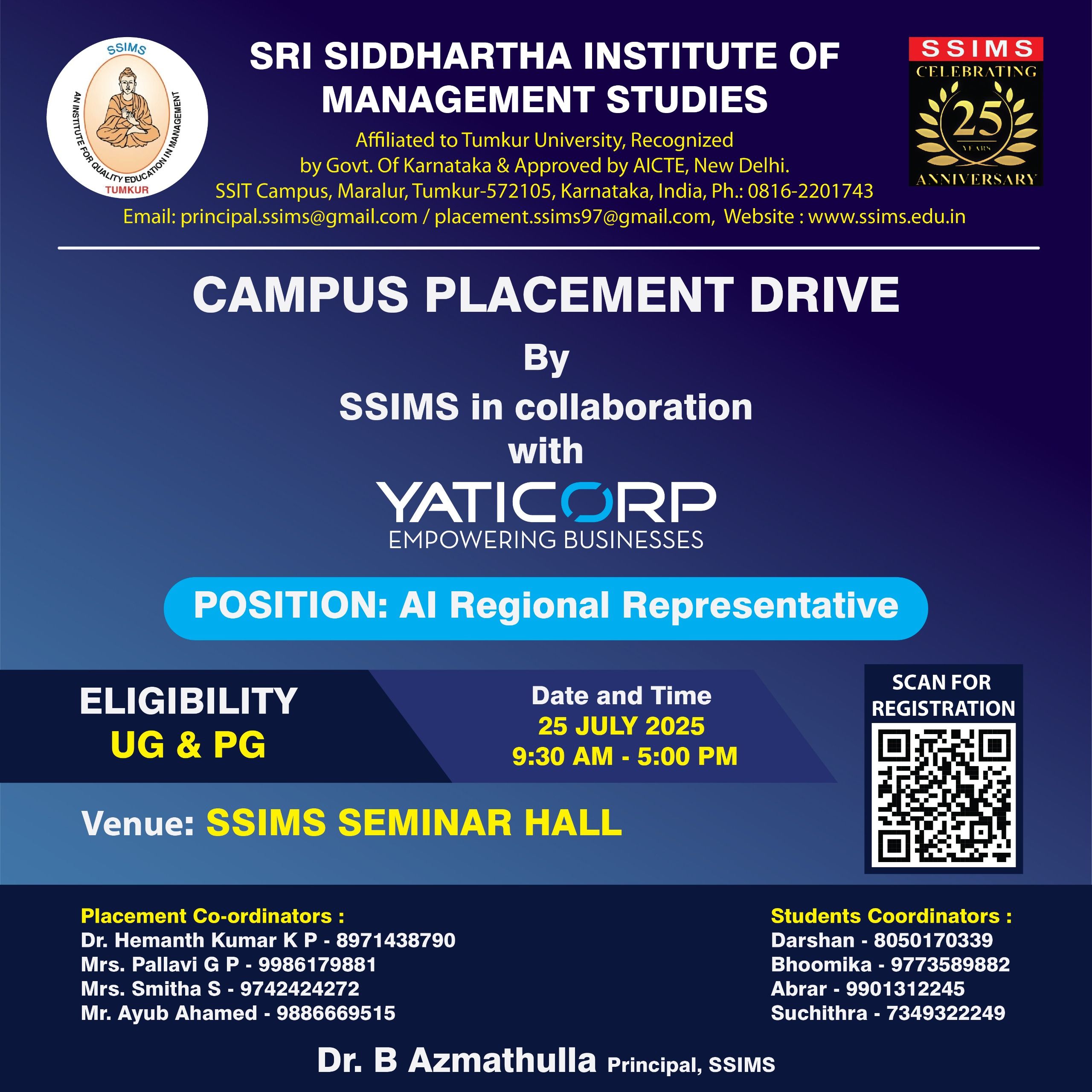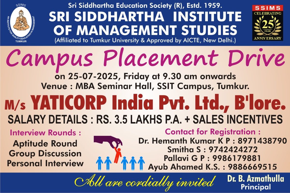 SSIMS in collaboration with Yaticorp India Pvt. Ltd Bangalore Campus Placement Drive on 25/07/2025 Friday. Venue : SSIMS Seminar hall, SSIT campus, Tumkur.