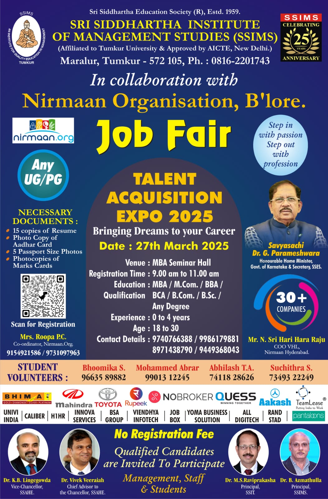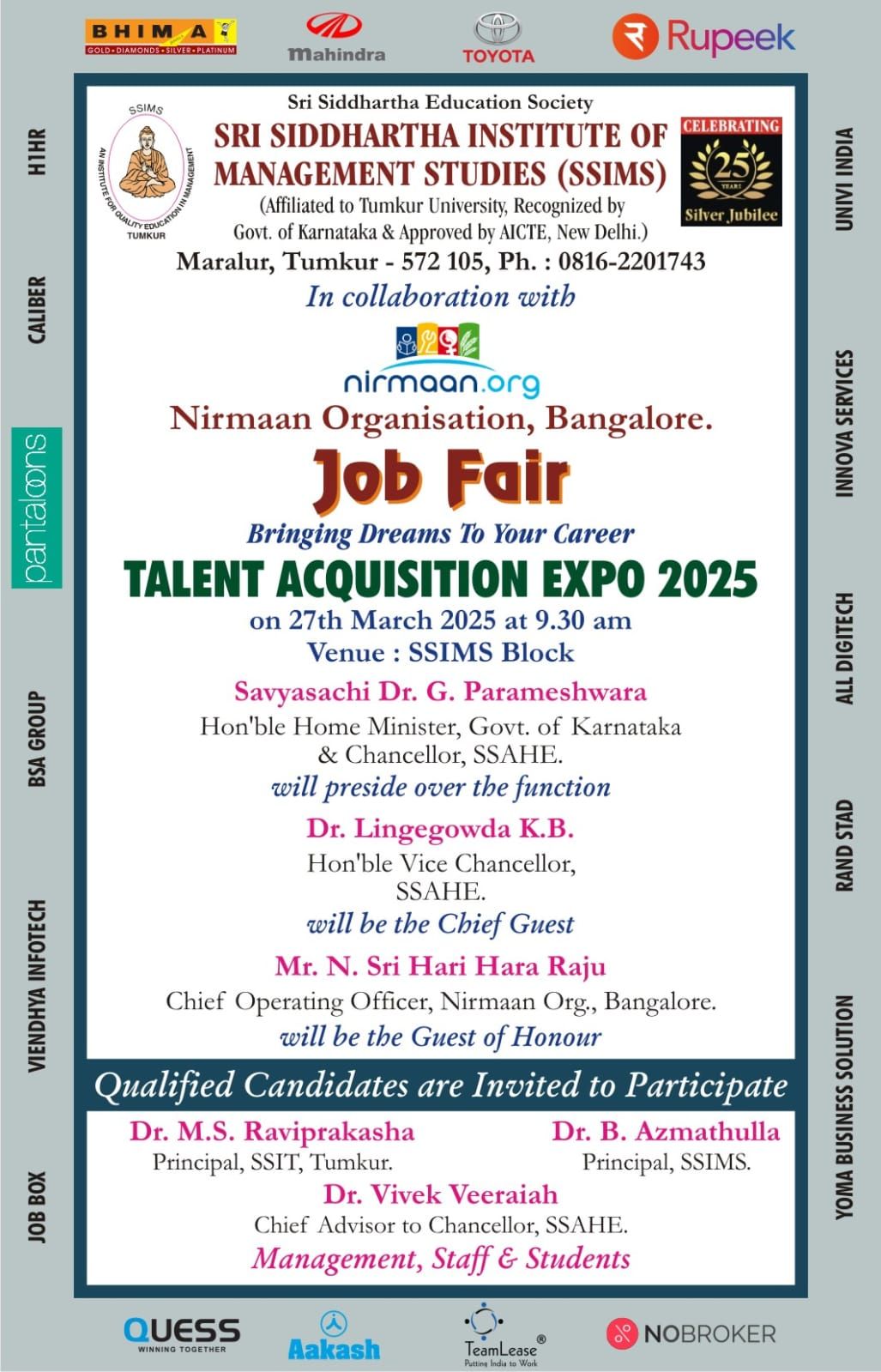 SSIMS Talent Acquisition Expo – 2025 Job Fair SSIMS In collaboration with Nirmaan Organisation, Bangalore. JOB FAIR- Talent Acquisition Expo – 2025 Date : 27-03-2025, DR. B AZMATHULLA PRINCIPAL, SSIMS SSIMS STAFFS, MANAGEMENT AND I AND II YEAR MBA STUDENTS.